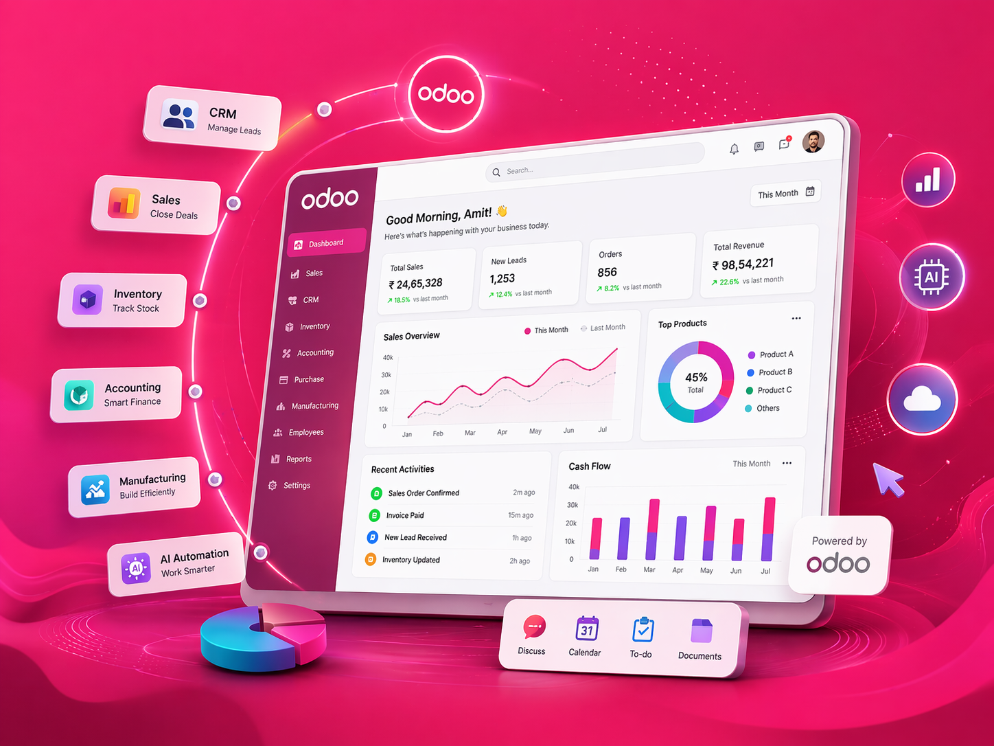 Odoo connects your entire business — from Sales and CRM to Inventory,